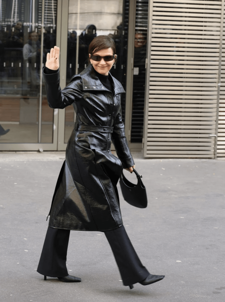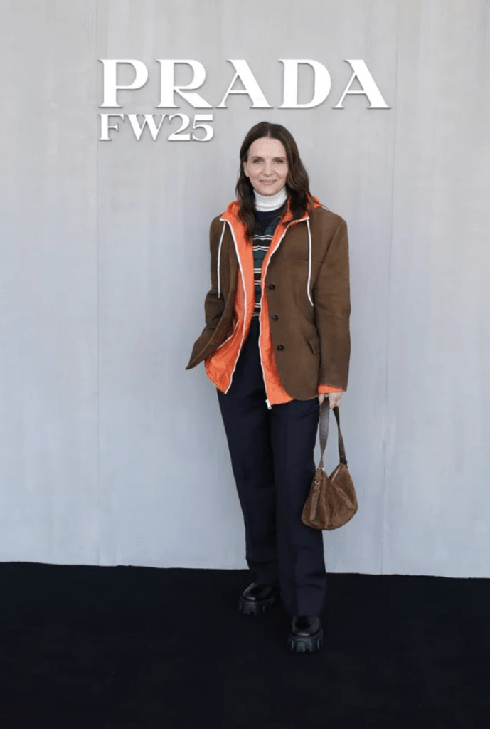 Aunque siempre ha mantenido una cierta distancia, Juliette Binoche no deja de ser una figura respetada en el mundo de la moda. Habitual del front row de Prada, asiste siempre que puede a los desfiles de Milán. Durante la presentación de la FW26 de la marca de lujo italiana, Binoche lució un look masculino original, con un impermeable naranja bajo un blazer de cuero con hombros anchos, pantalón de traje oversize y botas de suela dentada, uno de los sellos de la marca. Una superposición de prendas inesperada que demuestra que sigue experimentando, componiendo una feminidad muy suya, alejada de las siluetas más convencionales de otras invitadas.