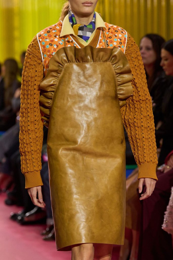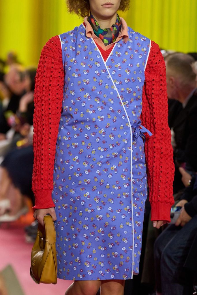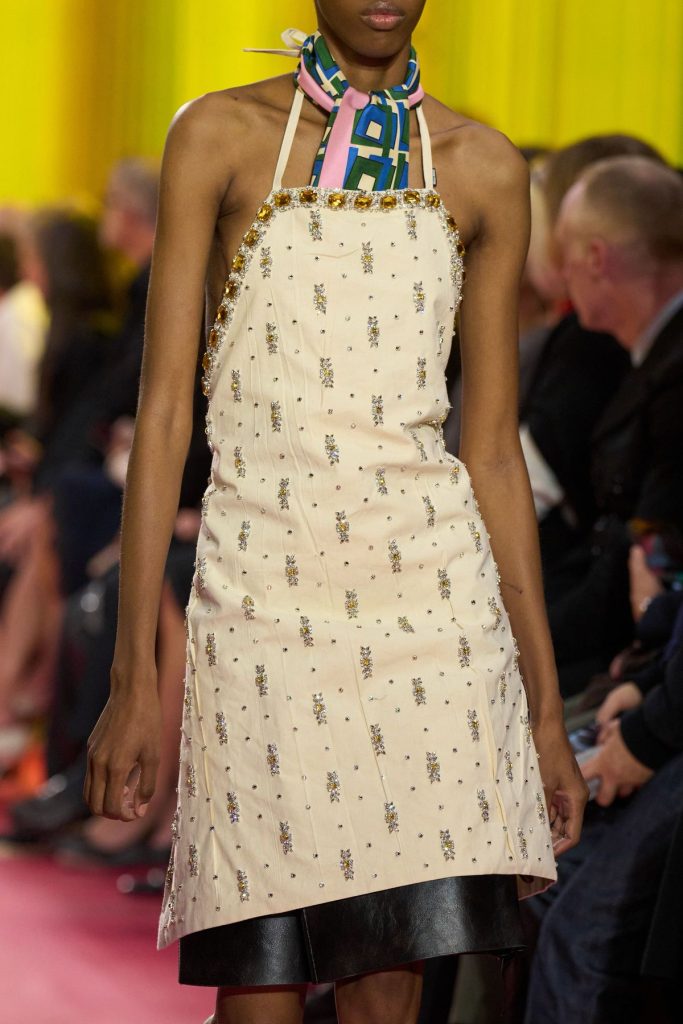 Miuccia Prada, fiel a su gusto por las paradojas, no quiere glorificar a las amas de casa (para desgracia de la tendencia Mob wife). Más bien al contrario: extrapola estas prendas de su marco doméstico y las hace desfilar sobre la pasarela. Este gesto, a la vez conceptual y político, rinde homenaje a las mujeres que las llevaron por necesidad, estableciendo al mismo tiempo una nueva forma de reivindicación femenina. Además, las mesas de formica de colores que sirven de asientos para los invitados refuerzan el paralelismo entre un interior doméstico y la estética del desfile.