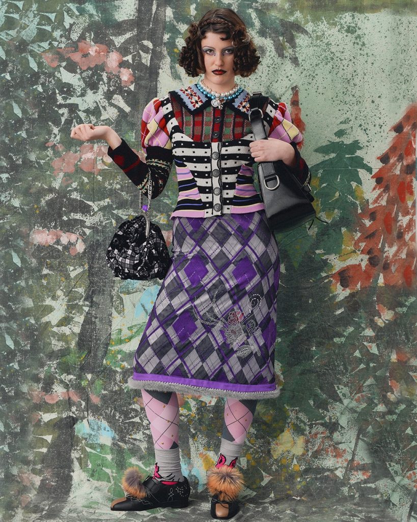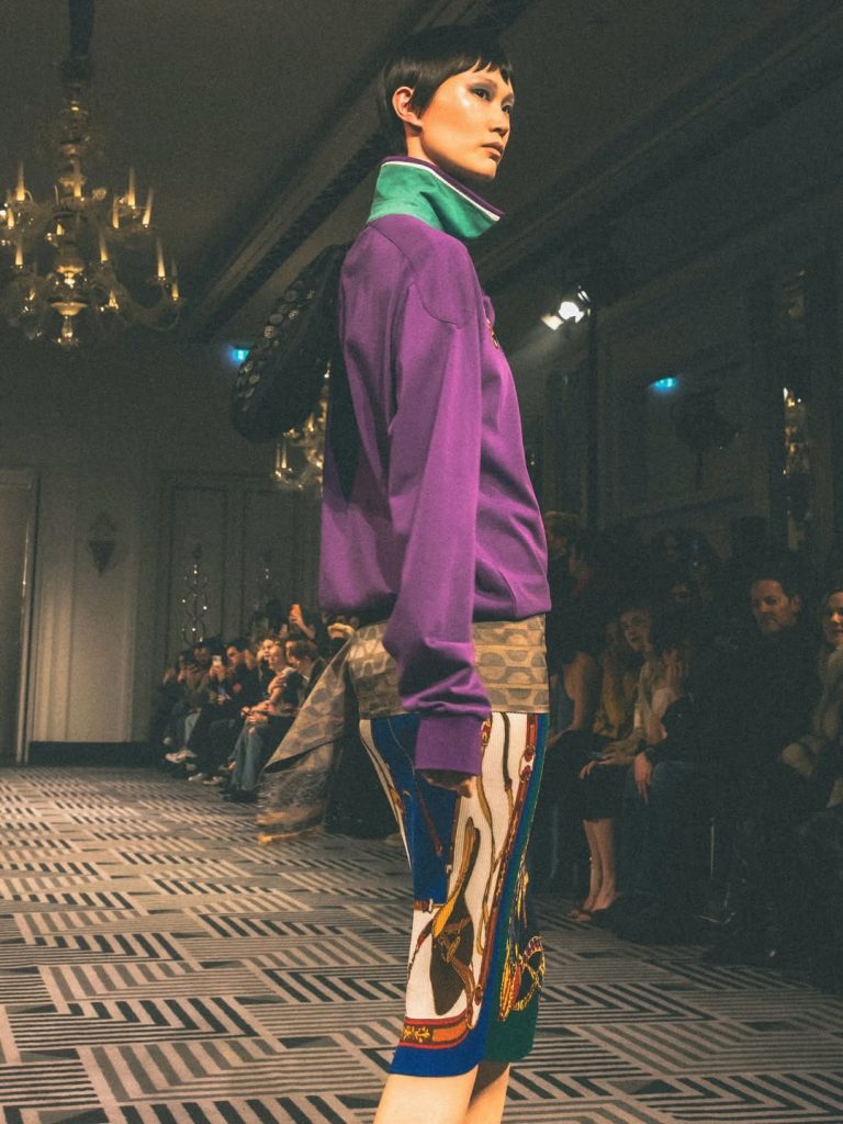 En Chopova Lowena se mezclan múltiples influencias, creando un estilo entre el regency core y una mañana en un green cortado a la perfección. Las faldas plisadas, marca indiscutible del dúo, siguen presentes, pero detrás de este diseño hay sobre todo un enfoque circular, con la reutilización de prendas procedentes de colecciones anteriores.