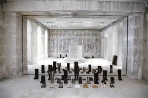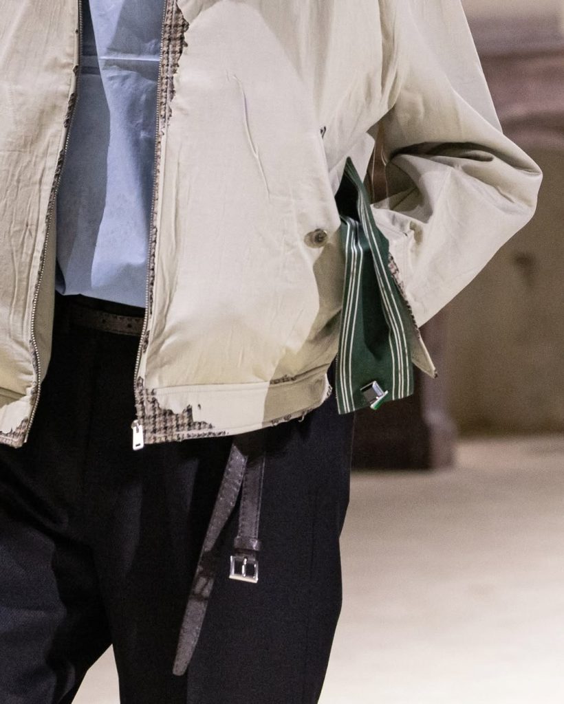 A su lado, una cazadora de cuero parece esperar a su dueño. Los numerosos pinsque la cubren son una metáfora evidente del paso del tiempo, de los lugares recorridos y de los recuerdos acumulados. En el suelo, los zapatos serpentean formando un camino sinuoso. Una escenificación con la que el diseñador pretende mostrar las múltiples facetas del hombre que imagina, tanto para esta temporada como más ampliamente, dentro de una de las marcas más emblemáticas del grupo LVMH.