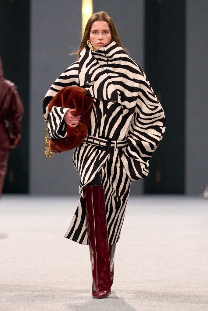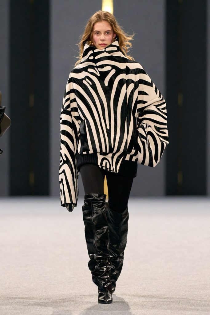 La prueba son las siluetas de la colección Otoño-Invierno 2025 de Balmain, que presentan a una mujer poderosa, subida a unas botas mosqueteras  XXL, vistiendo volúmenes exagerados con una energía salvaje, pero sin caer en los estereotipos. El estampado de cebra, menos corriente, conquista por su contraste gráfico.