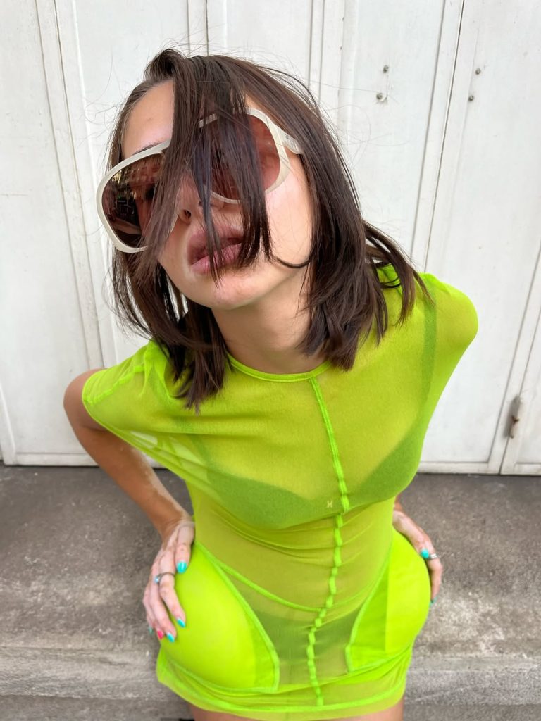 El «cunti cunta», una expresión creada por Loeva, cofundadora de las JUDE Party, cristaliza también una nueva forma de abordar el neón. Un estilo que se opone frontalmente a la clean girl:  vestido asimétrico amarillo ácido, minishort y bañador fluorescentes llevados sin complejos, joyas XXL con un aire completamente ochentero…Los tonos llamativos no son un simple detalle sino una forma de jugar con el kitsch y de afirmar una identidad muy colorida.