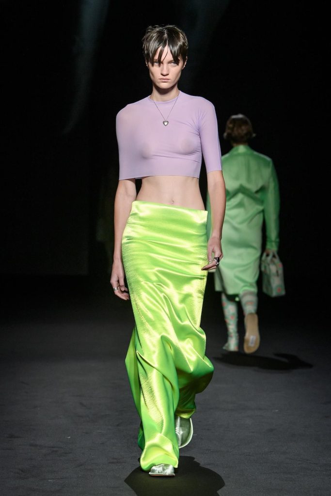 Pero eso no es todo. Una década más reciente, la de los años 2010, vuelve también con fuerza, sobre todo en las redes sociales. Una época en la que los tonos llamativos invadían todas las siluetas y en la que nada escapaba a la saturación cromática. Off-White, Balenciaga y Philipp Plein explotaron plenamente los colores eléctricos, haciendo del neón un elemento central de sus colecciones y de su identidad visual durante la década pasada.