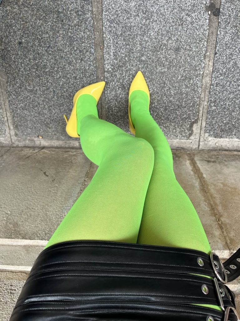 Para quienes tienen dudas sobre cómo adoptar esta tendencia, los detalles pueden ser un buen comienzo. Un par de calcetines color lima o unas medias de tonos ácidos reavivan cualquier look. Las influencers Manon y Lilas suelen recurrir a unas notas de color neón en sus outfits, jugando muy a menudo con las tendencias de las medias en tonos llamativos.