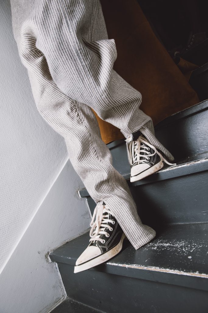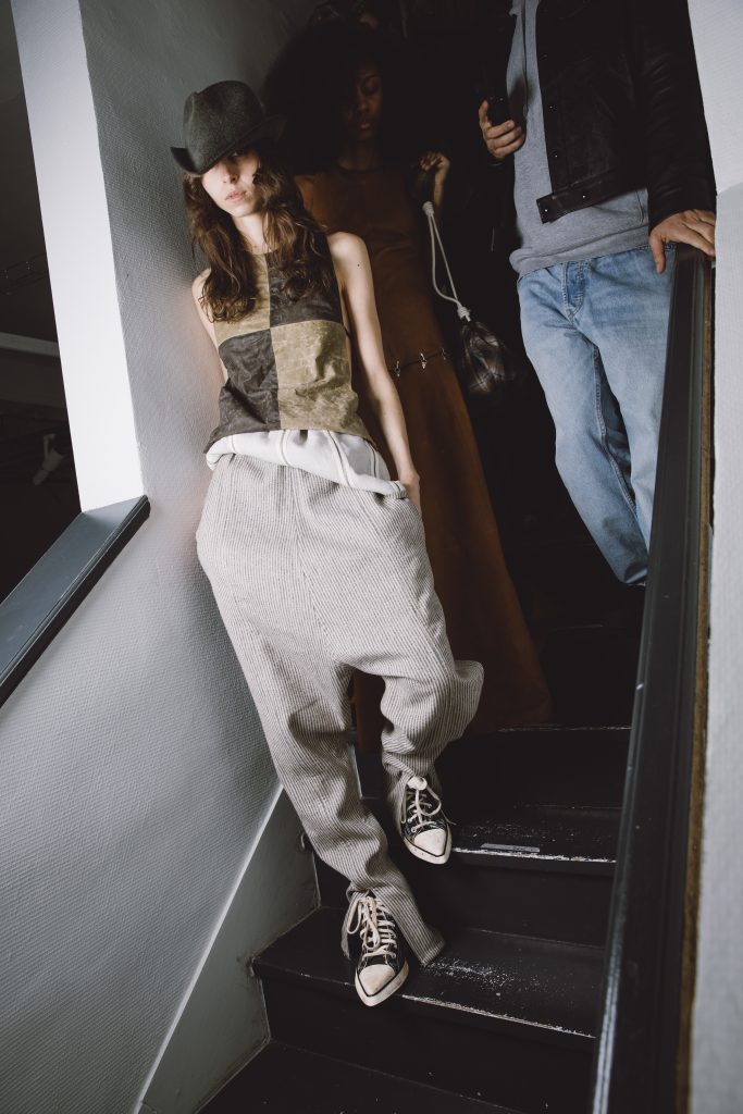 Para este desfile, el diseñador ha elegido el bosque como punto de partida. Un espacio ambiguo que puede ser refugio y amenaza, donde la identidad puede expresarse libremente lejos de las convenciones sociales. En este escenario cargado de simbolismo, las sneakers amplifican ese sentimiento de ambivalencia. El diseñador reinterpreta la icónica Chuck Taylor All Star de Converse con texturas inesperadas y acabados singulares. Materiales encerados, tratamientos impermeables y un claro toque práctico que se integra perfectamente en la estética outdoor de la colección. Una sutil relectura que demuestra cómo un clásico puede integrarse en un estilo de moda mucho más conceptual.