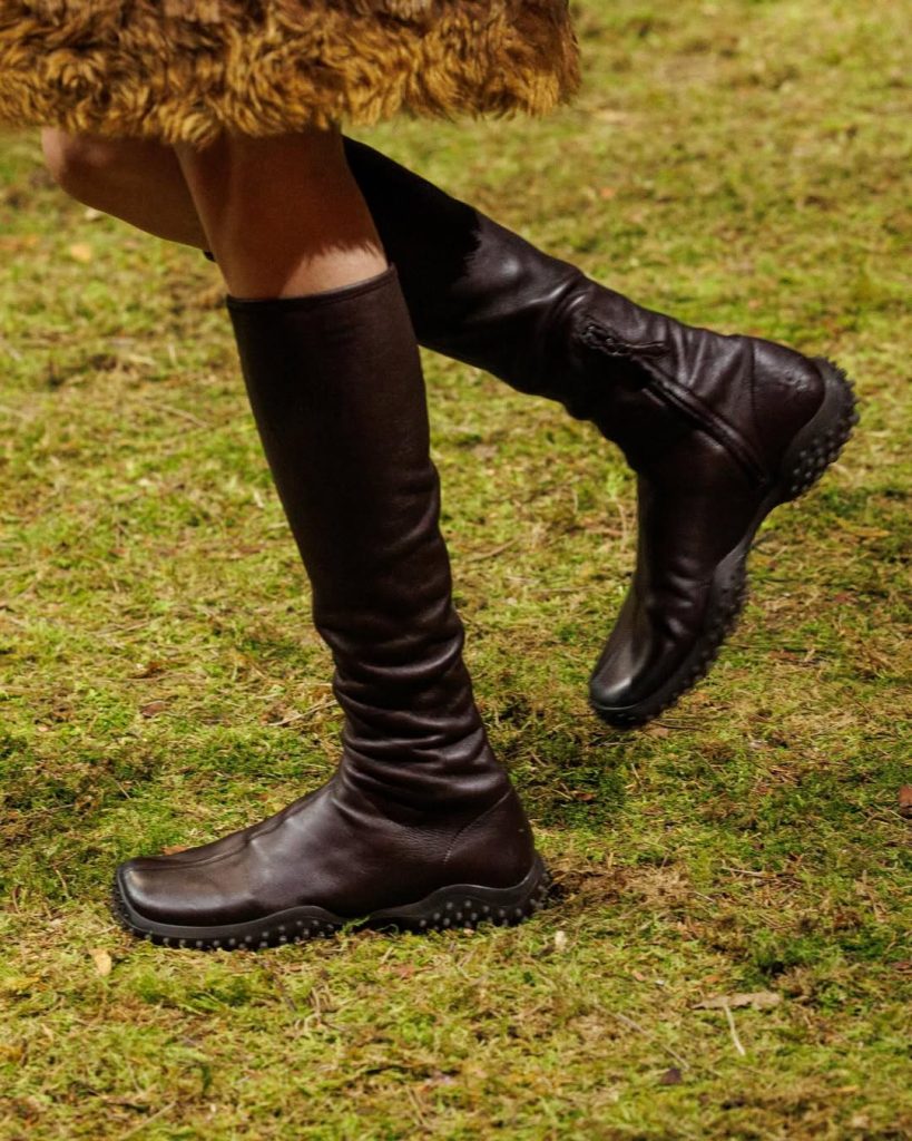Presentada en los albores del nuevo milenio, esta suela futurista fue un punto de inflexión en su época, en un contexto marcado por la fantasía tecnológica y el famoso bug del año 2000. Un elemento que simbolizaba una nueva manera de concebir el calzado, con siluetas híbridas que mezclaban deporte, moda y experimentación. Más de veinticinco años después, esta suela vuelve a estar presente tanto en las sneakers como en los mules o las botas. La nueva línea se mueve entre una estética gorp-core y un espíritu deliberadamente quirky, con modelos que a veces recuerdan el estilo de las Prada America’s Cup. En los laterales, delicados detalles de pedrería feminizan el calzado, creando un contraste sorprendente.