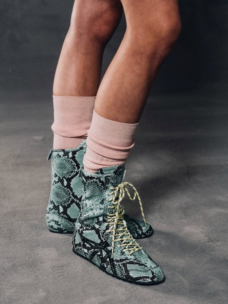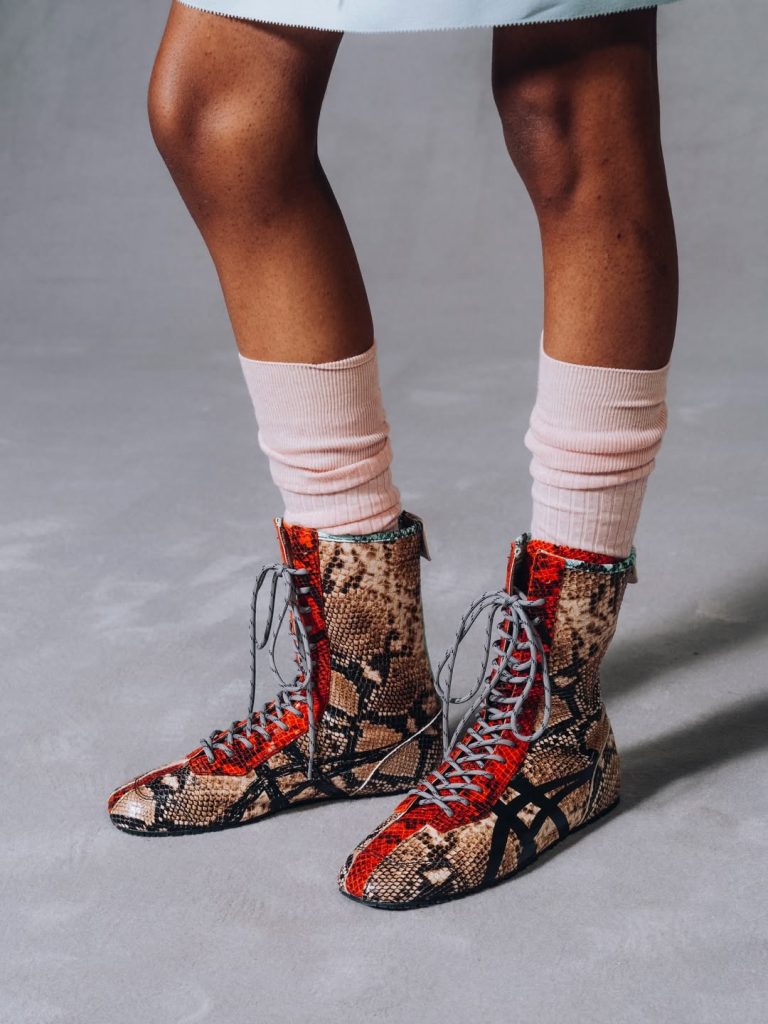 Con esta idea como hilo conductor, la marca confirma su intención de estar presente en todos los momentos de la vida, tanto en las vivencias cotidianas como en las ocasiones más especiales. Una filosofía que se materializa en el calzado con unas sneakers muy cómodas, reinterpretadas en versiones altas (como la emblemática Mexico 66 transformada al estilo boxing), adornadas con estampados de serpiente, uno de los motivos estrella del año. Una forma de recorrer la ciudad con piezas prácticas y a la vez sofisticadas.