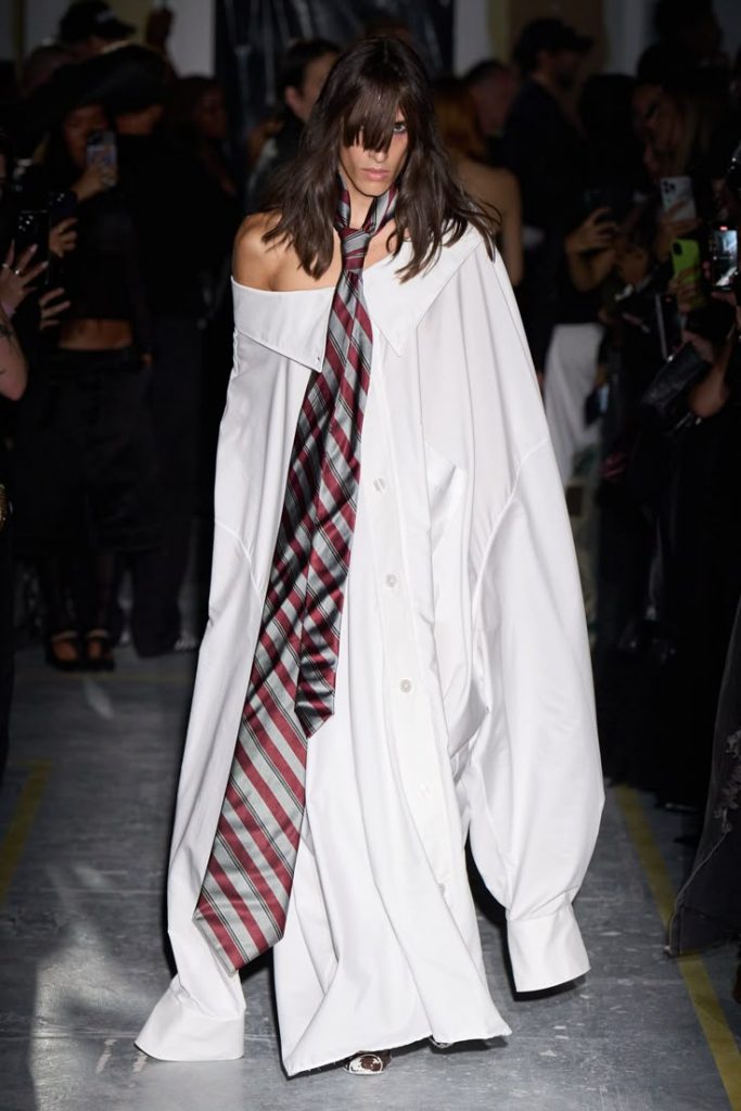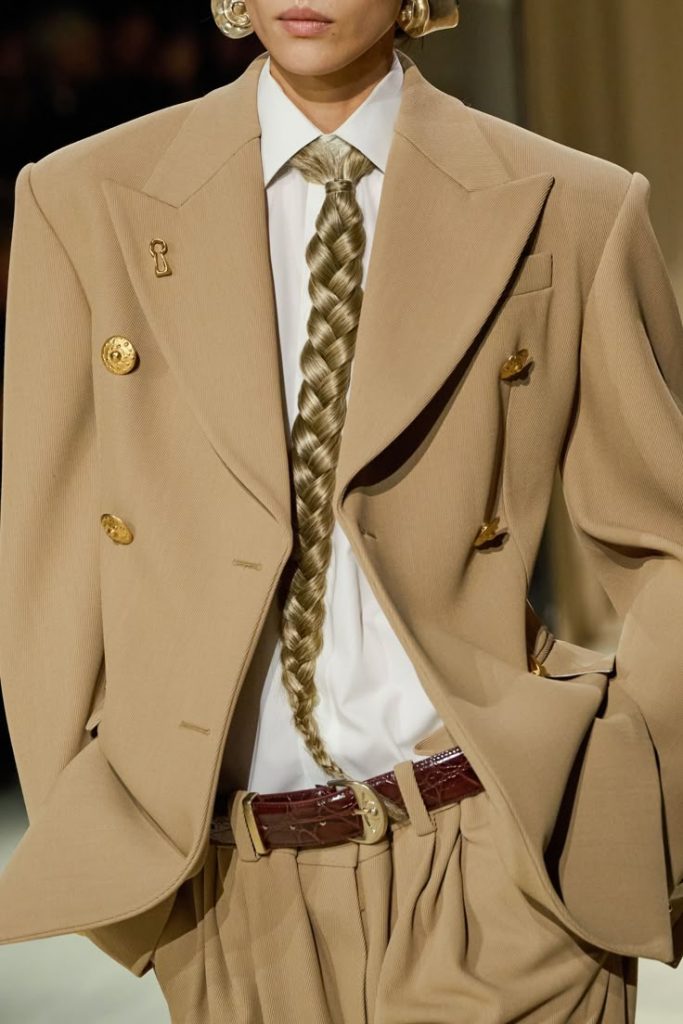 Los creadores no se equivocan: la corbata es un accesorio con gran potencial que las grandes marcas ya están interpretando a su manera. En Gucci (otoño/invierno 25-26), se transforma en una joya o se difumina en tonos similares. En Schiaparelli, Daniel Roseberry la reinventa a partir de mechones de cabello, con una buena dosis de surrealismo y un toque de provocación. Estas reinterpretaciones sofisticadas conviven con otras más brutales, pero igualmente inventivas, provenientes de los jóvenes creativos. En Hodakova (otoño 2024), se confecciona con medias y se asocia a un vestido escultural hecho con una maleta de cuero. Willy Chavarria la deja sobresalir de chaquetas abotonadas hasta el cuello. Vaquera la imagina en versión XXL sobre una camisa de proporciones igualmente exageradas. Por su parte, Egonlab la transforma en una larga bufanda de lunares.